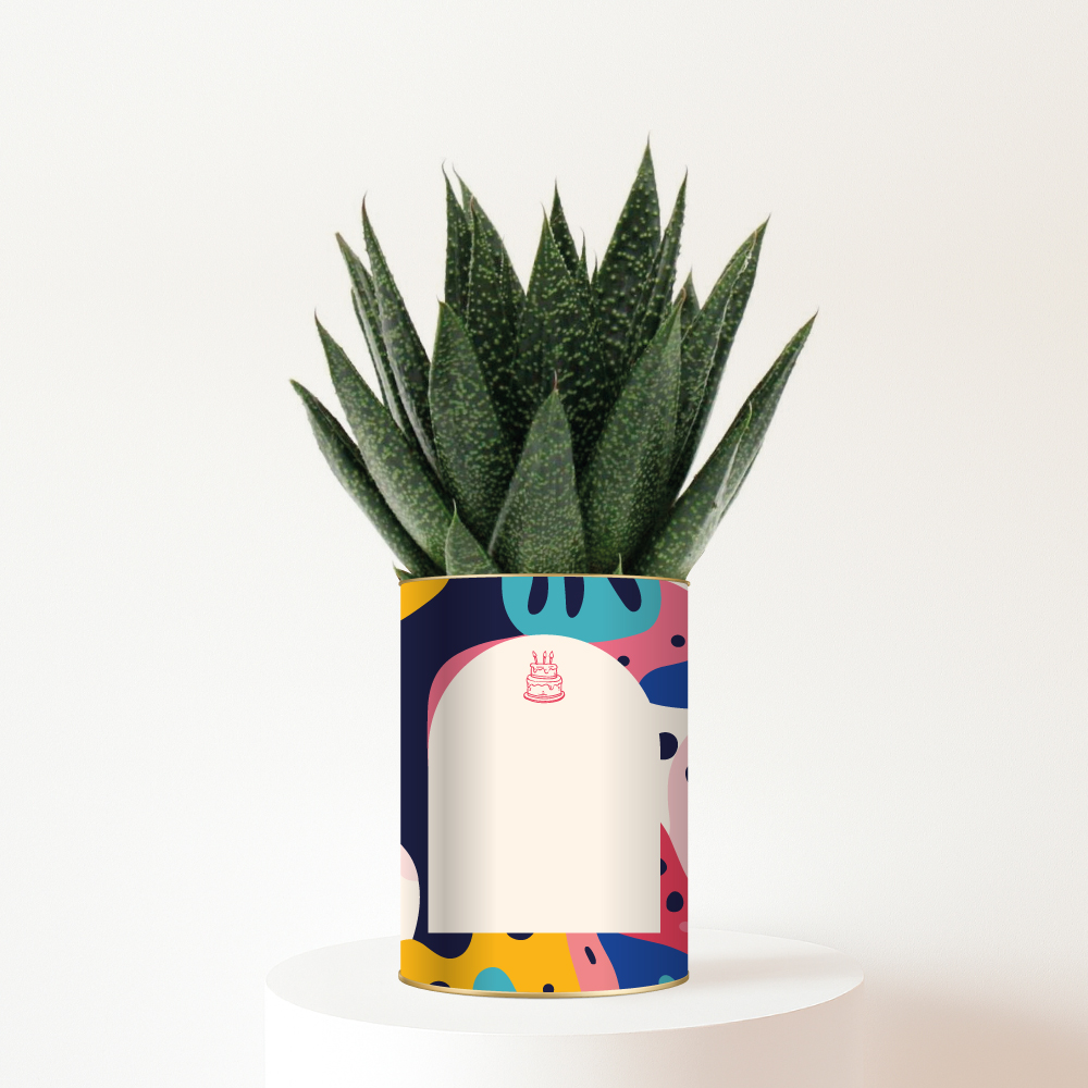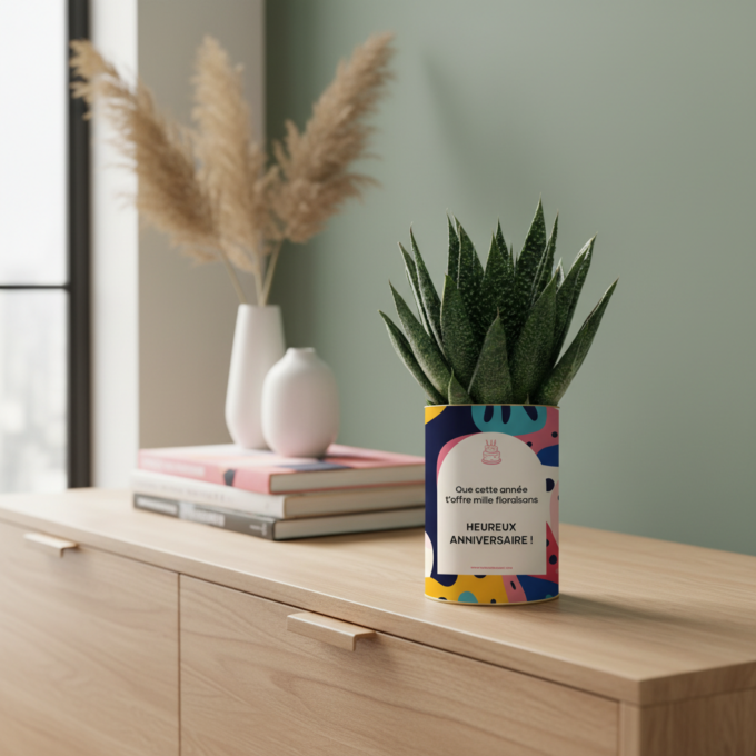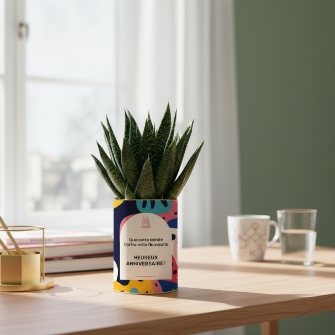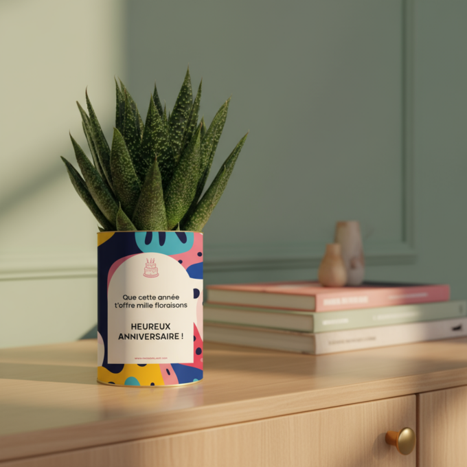 Offrez un souffle de verdure et de douceur avec cette plante personnalisée d’anniversaire. L’Haworthia Gasteria, élégante et résistante, apporte une touche de nature durable à chaque célébration. Son pot au design coloré et son message tendre « Heureux Anniversaire ! » en font un cadeau unique et plein de sens.