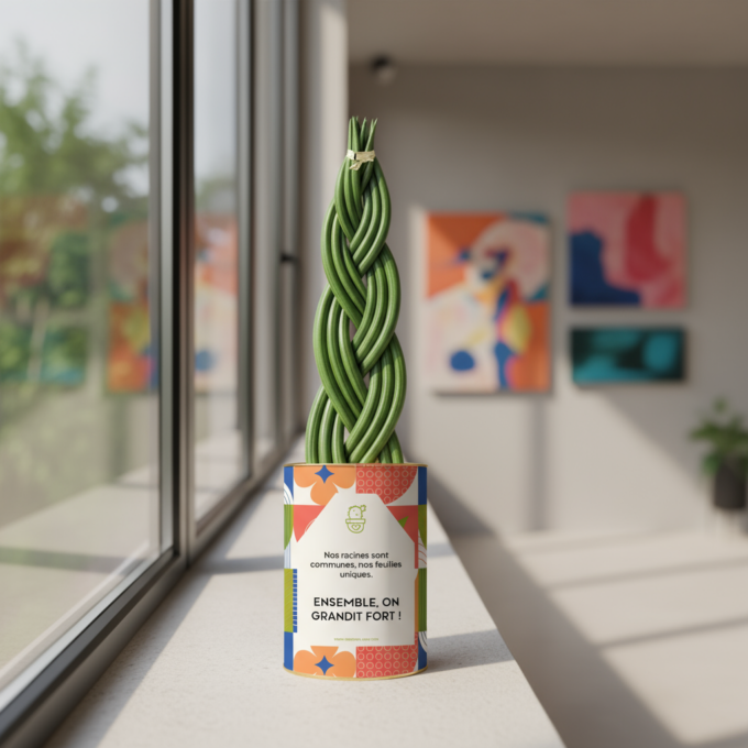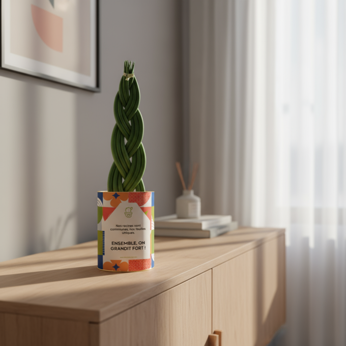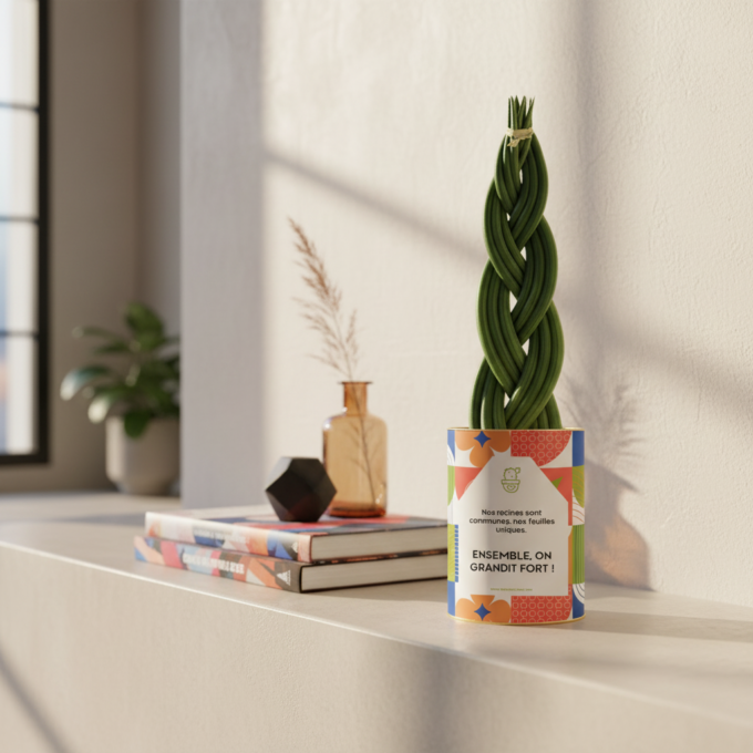 Parce qu’une famille, c’est avant tout une histoire de racines communes et de chemins uniques, cette sansevieria twister personnalisée porte en elle tout le sens du message “Ensemble, on grandit fort !”. Chaque tige tressée évoque le lien invisible qui unit les cœurs d’une même tribu, même quand la vie les fait pousser dans des directions différentes.