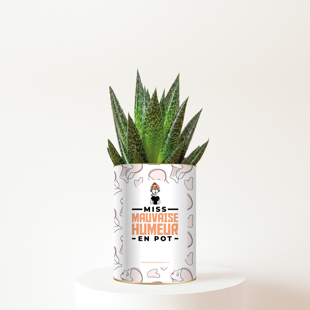 Une succulente Gasteria personnalisée qui mêle tendresse et humour. Avec son message « Miss mauvaise humeur en pot », elle devient un cadeau d’amitié aussi joli que taquin.