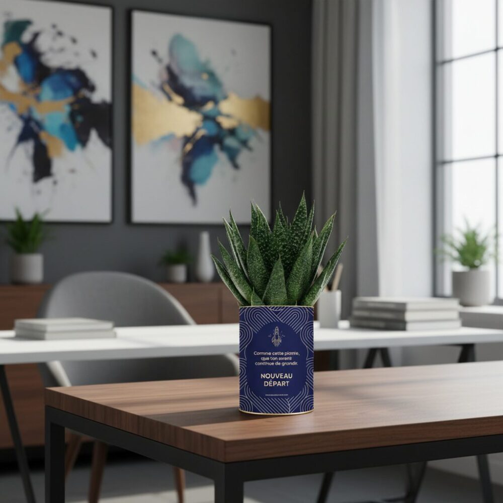 Offrir une plante personnalisée pour un départ professionnel, c’est choisir un message qui dure. Cette Haworthia, graphique et élégante, accompagne les transitions de vie avec douceur et confiance. Elle incarne le passage vers un nouveau départ, celui qui ouvre la voie à de nouvelles opportunités.