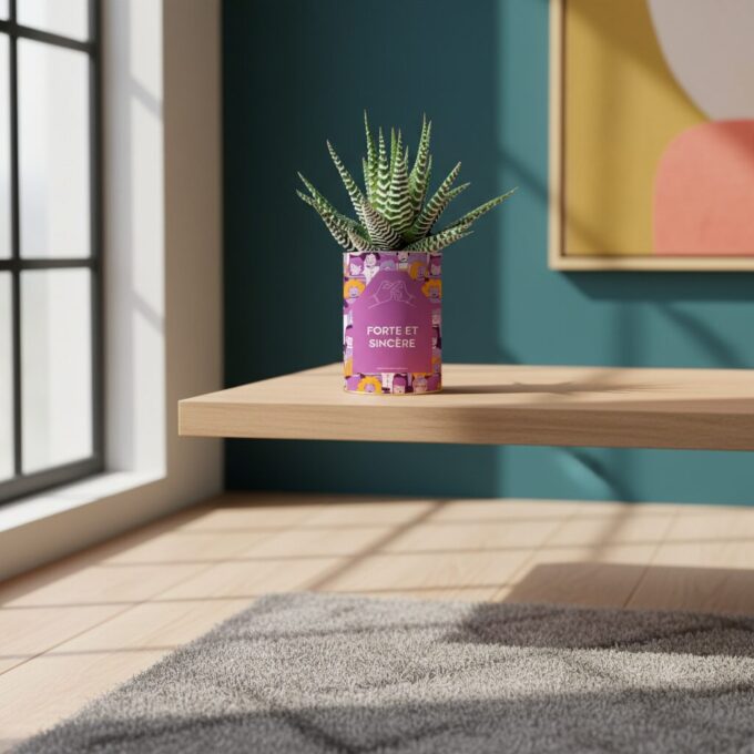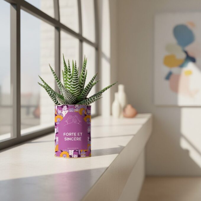 La Gasteria « Forte et sincère » célèbre les amitiés féminines vraies et solides. Son feuillage zébré symbolise la force, tandis que son pot violet illustré respire la joie et la complicité. Une plante personnalisée pleine de sens, à offrir à une amie chère.