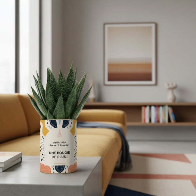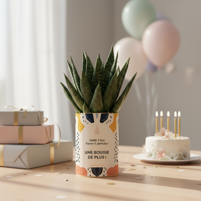 Offrez une touche de verdure pleine d’humour avec cette Gasteria personnalisée au message d’anniversaire : « Vieillir ? Oui. Faner ? Jamais ! Une bougie de plus ! ». Une plante robuste et symbolique, qui rappelle que la beauté ne fane jamais.