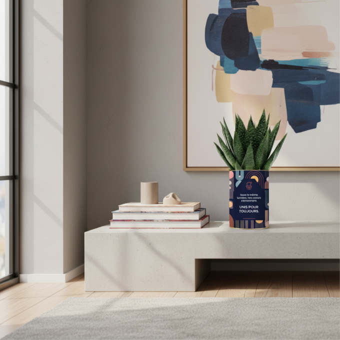 Le pot au design graphique contemporain, aux teintes profondes et chaleureuses, met en valeur le message d’unité et d’amour éternel. Il devient un cadeau symbolique à offrir à ses proches, parents ou enfants, pour dire “Nous sommes unis, quoi qu’il arrive”.