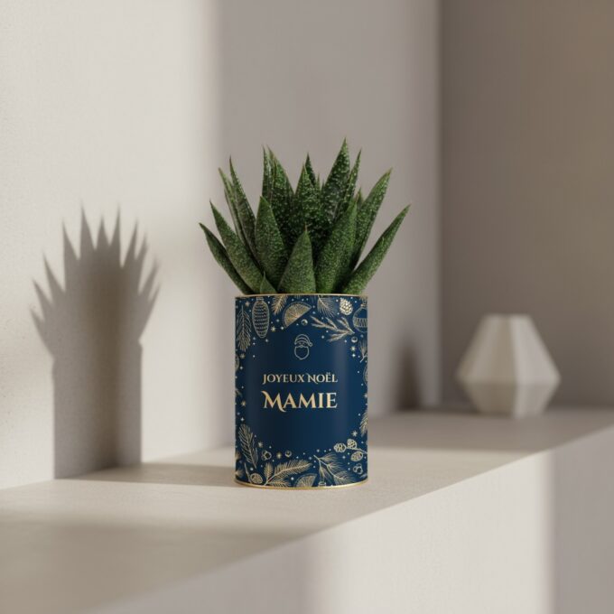 Offrez à votre grand-mère une touche de verdure et d’amour avec cette plante personnalisée « Joyeux Noël Mamie ». L’Haworthia Gasteria, élégante et facile d’entretien, s’habille d’un pot festif aux reflets dorés pour illuminer les fêtes.