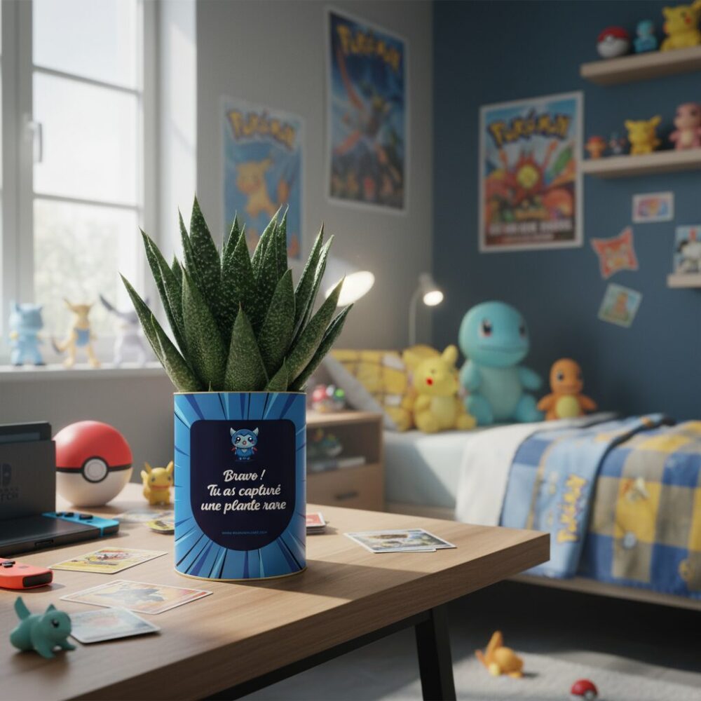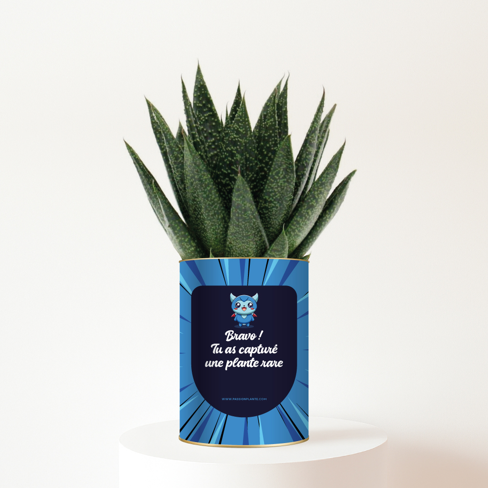 Une succulente Gasteria pensée pour les enfants, avec un design manga vibrant et un petit personnage plein d’énergie. “Bravo ! Tu as capturé une plante rare” : un message qui transforme la plante en trésor vivant.