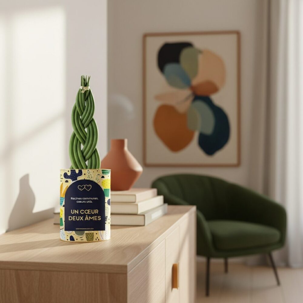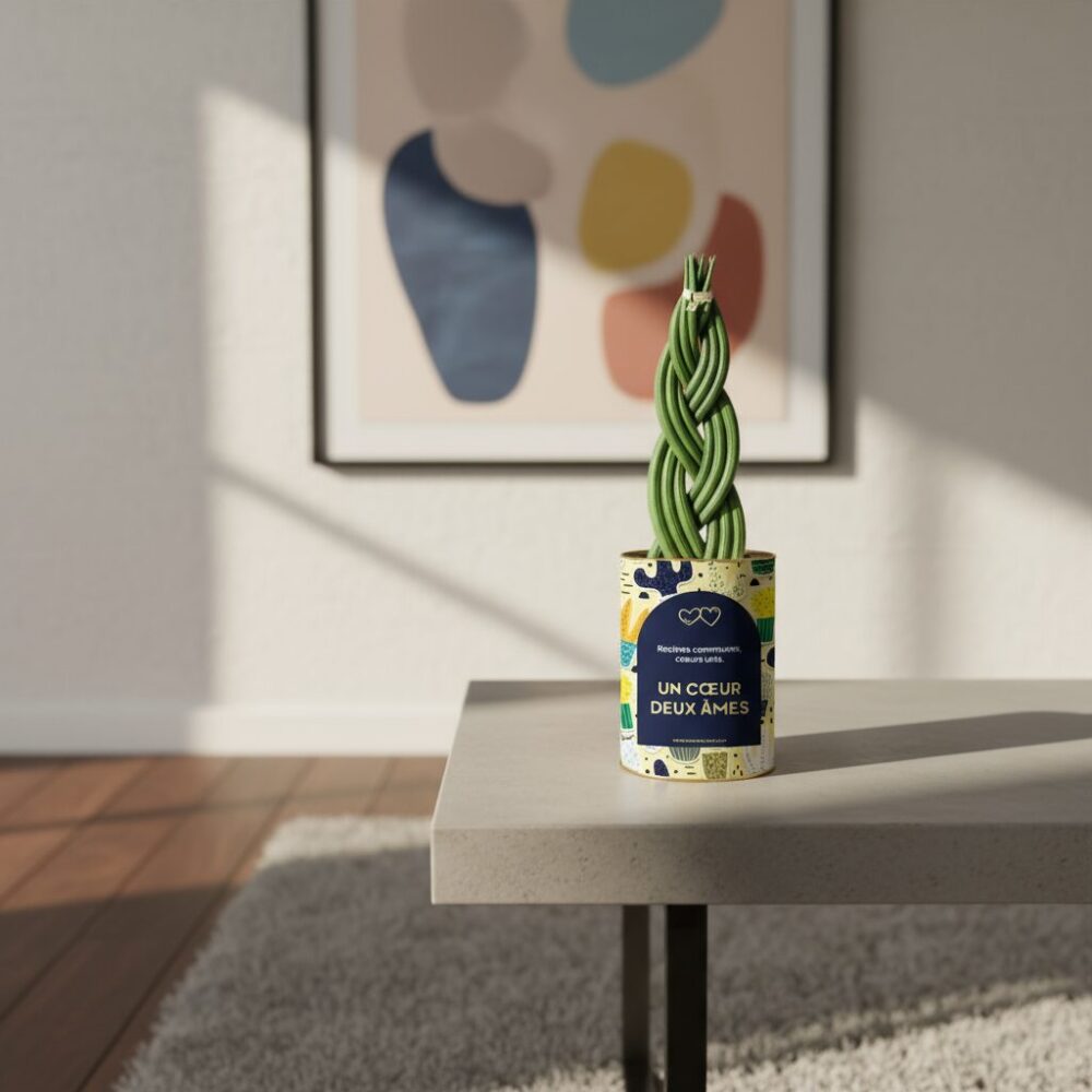- Plante : Sansevieria tressée (langue de belle-mère) – symbole de persévérance et d’unité.